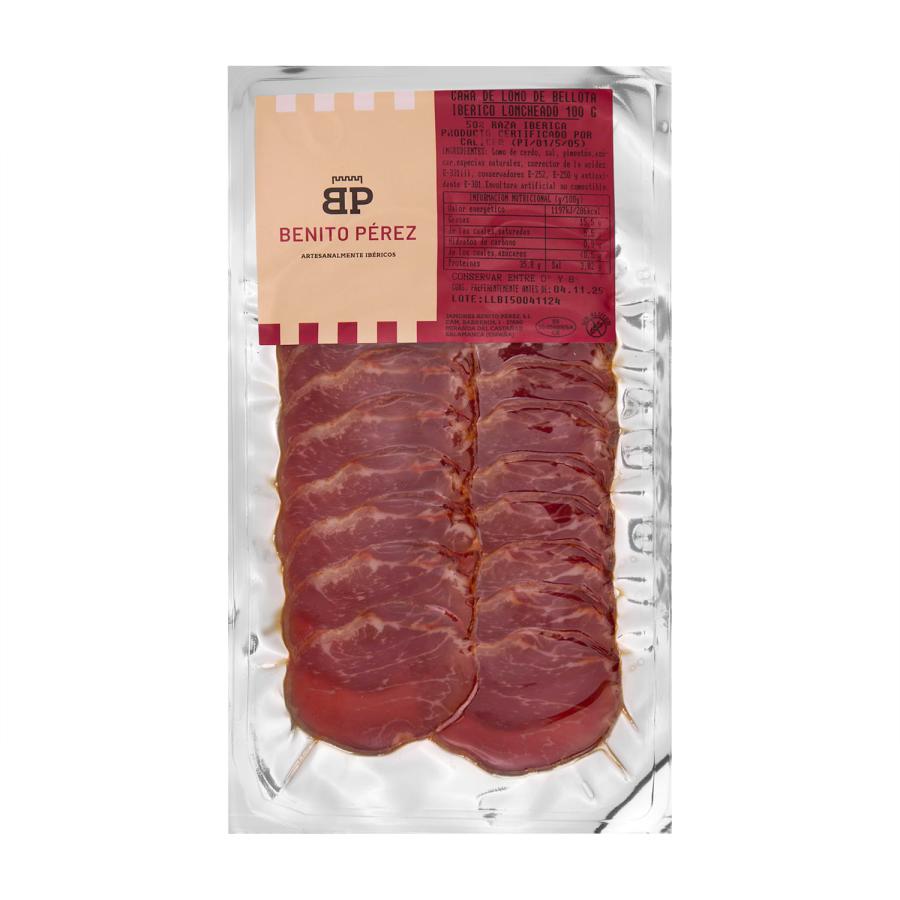 Cómodos sobres de 100 gramos de lomo ibérico procedente de cerdos 50% raza ibérica alimentados de bellota en montanera.
