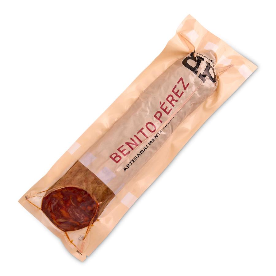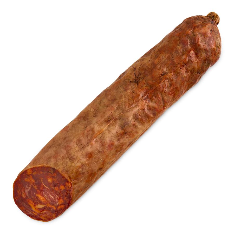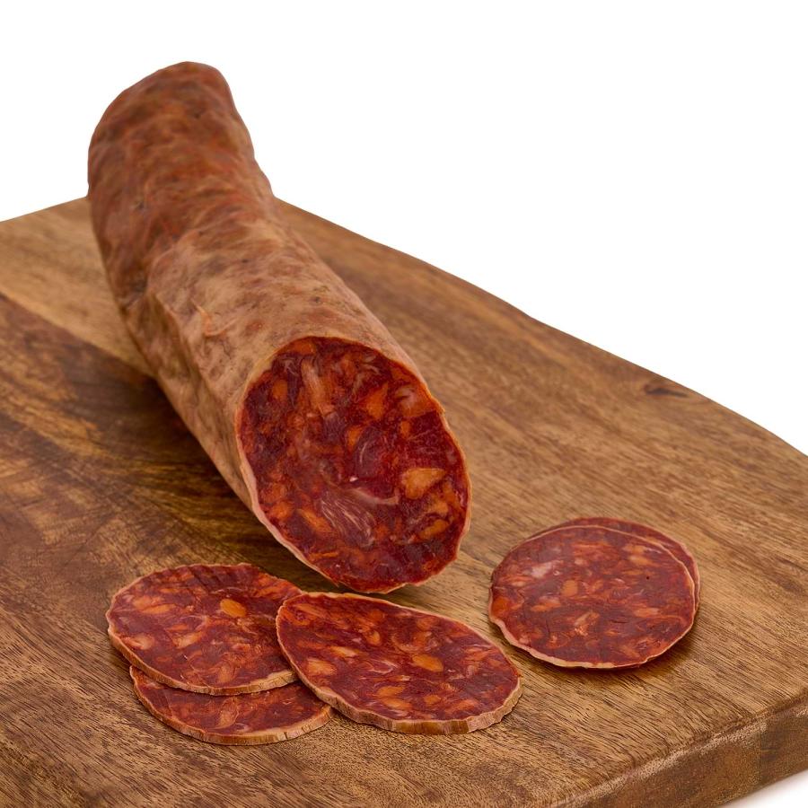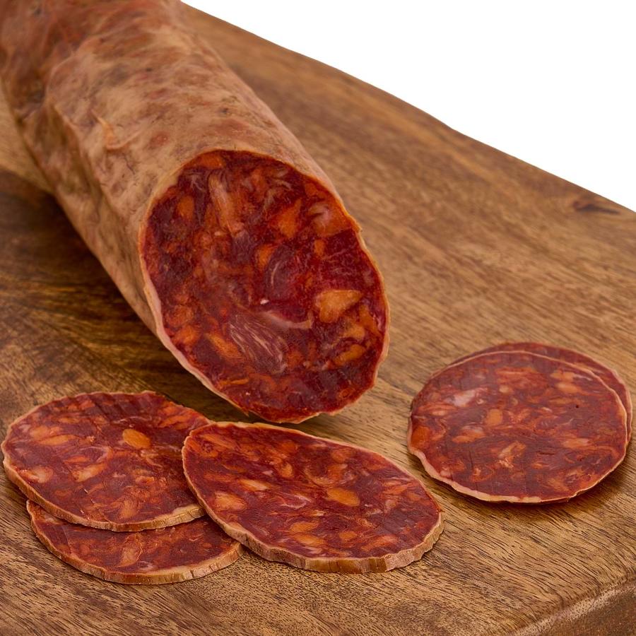 Chorizo aliñado de forma tradicional a base del mejor pimentón, embutido en tripa cular de cerdo y secado lentamente durante aproximadamente 5 meses en nuestros secaderos de jamones y embutidos de Salamanca.